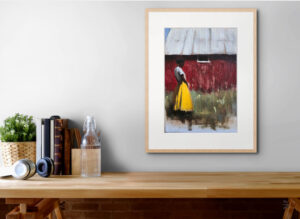 “Skarviken, Hanna” är en originalmålning i olja på panel, skapad i A4+-storlek. Motivet visar en stillsam scen vid sjön Immeln, intill en röd lada där solens ljus faller över en gul kjol – ett ögonblick av tystnad, eftertanke och lantlig frid.