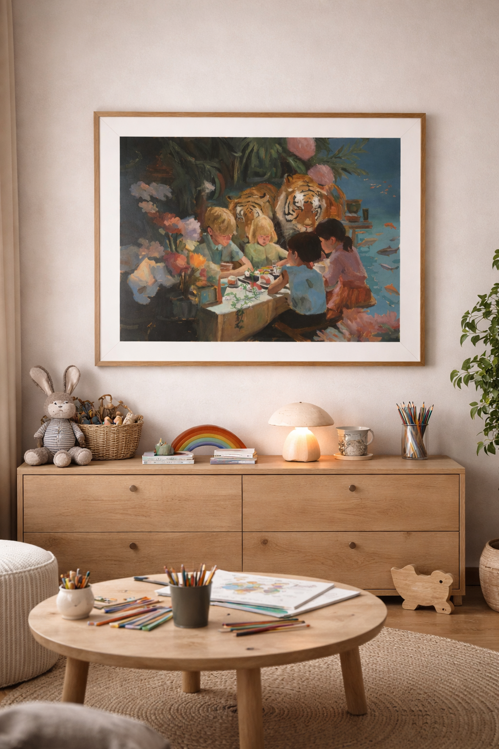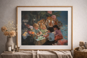 I Tigeryard samlas barn kring ett bord, försjunkna i skapande och gemenskap. Bakom dem vilar två tigrar – närvarande, beskyddande och lugna. Kontrasten mellan barnens koncentrerade värld och de majestätiska djuren skapar en drömlik berättelse om trygghet, fantasi och inre styrka.